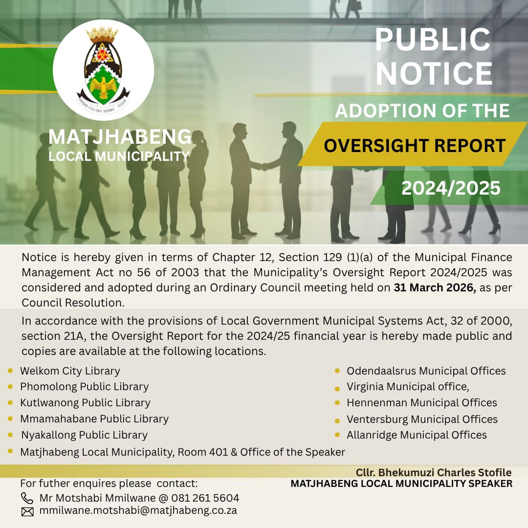Download ApplicationsCouncil of Matjhabeng Local Municipality has approved a full and final settlement campaign ending in march 2026 and is giving residents and business an opportunity to settle their municipal accounts.