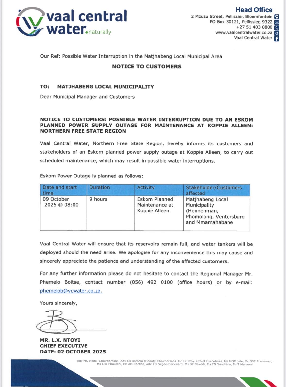 The Matjhabeng Local Municipality wishes to inform residents that Vaal Central Water has notified the Municipality of a