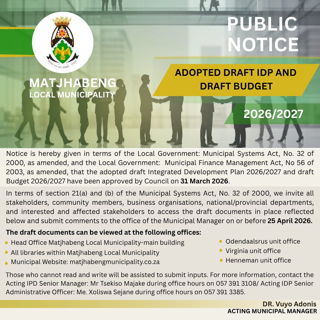 IDP DocumentsMatjhabeng Local Municipality Junior Council, 2026 Applications are open.