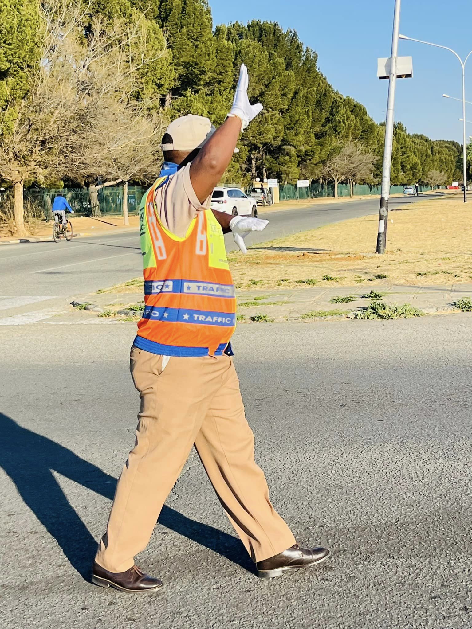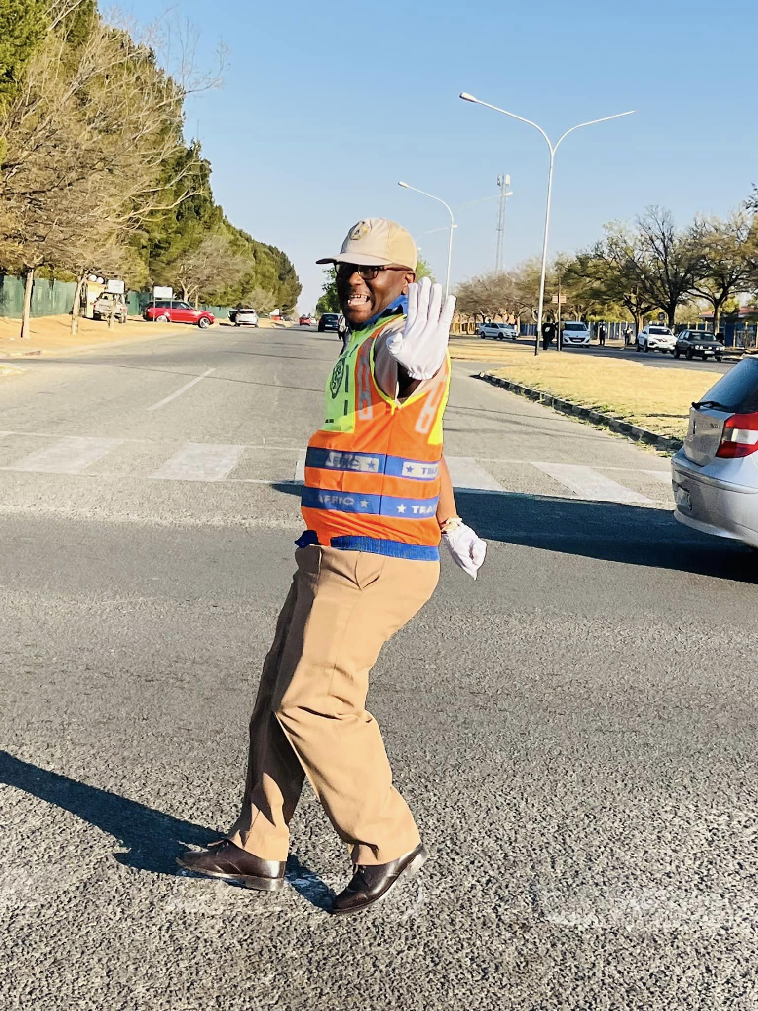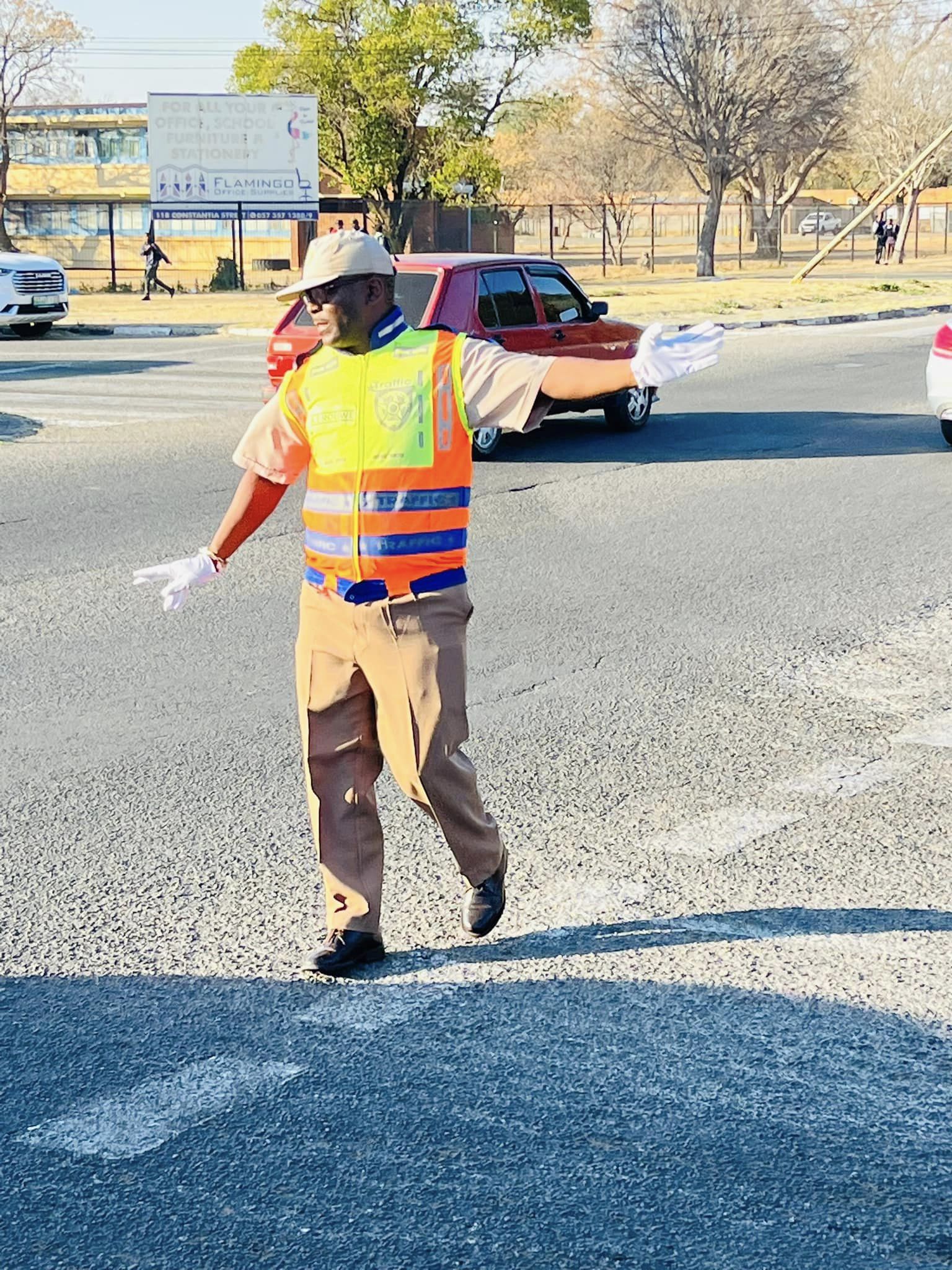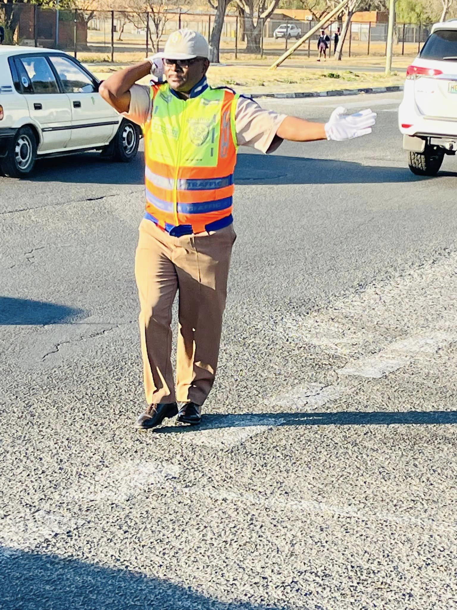 A traffic officer from the Matjhabeng Local Municipality is stationed between Unitas Secondary School and HTS to manage traffic flow and enhance the safety of both learners and road users.
