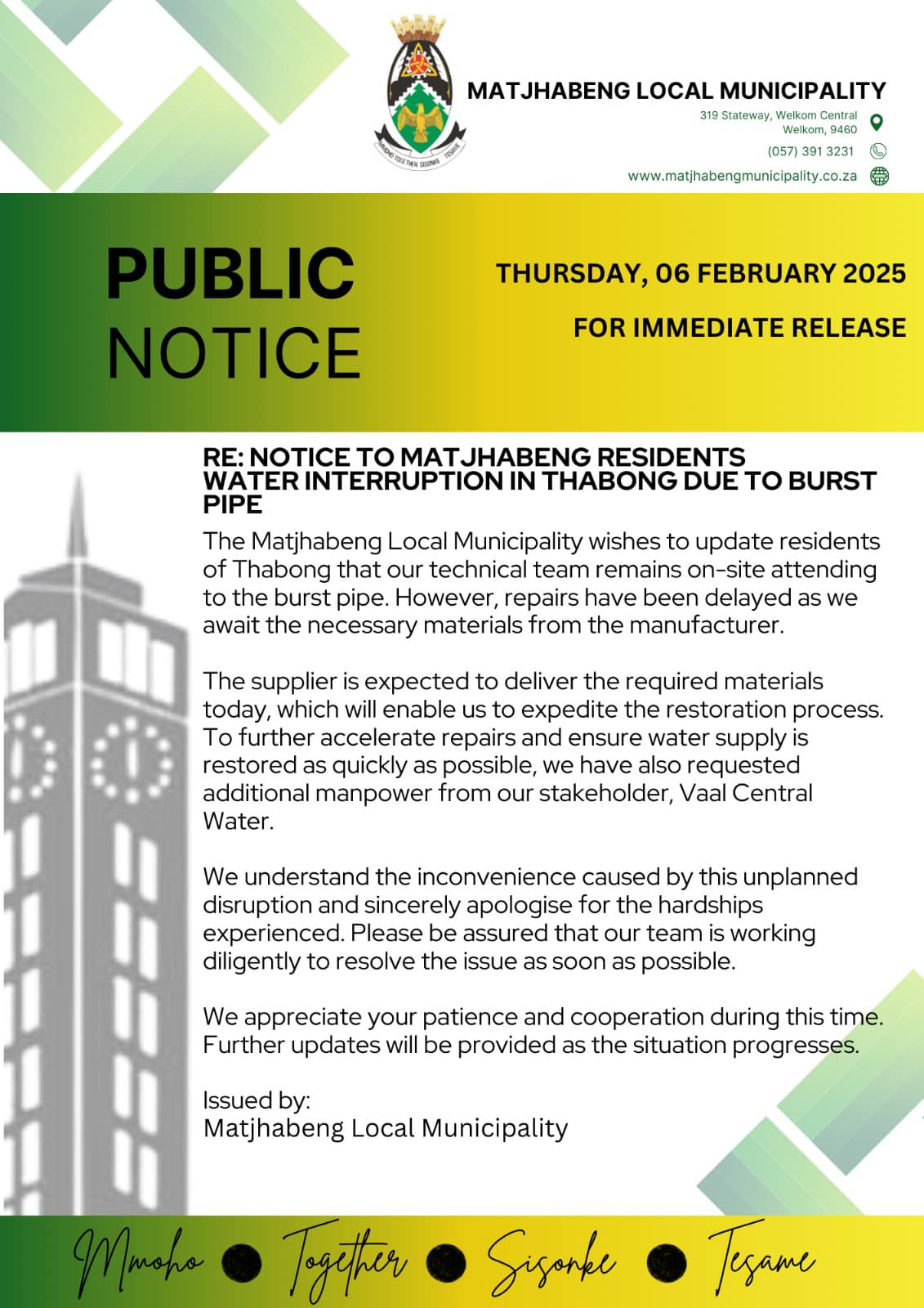 The Mathabeng Local Municipality wishes to update residents of Thabong that our technical team remains on-site