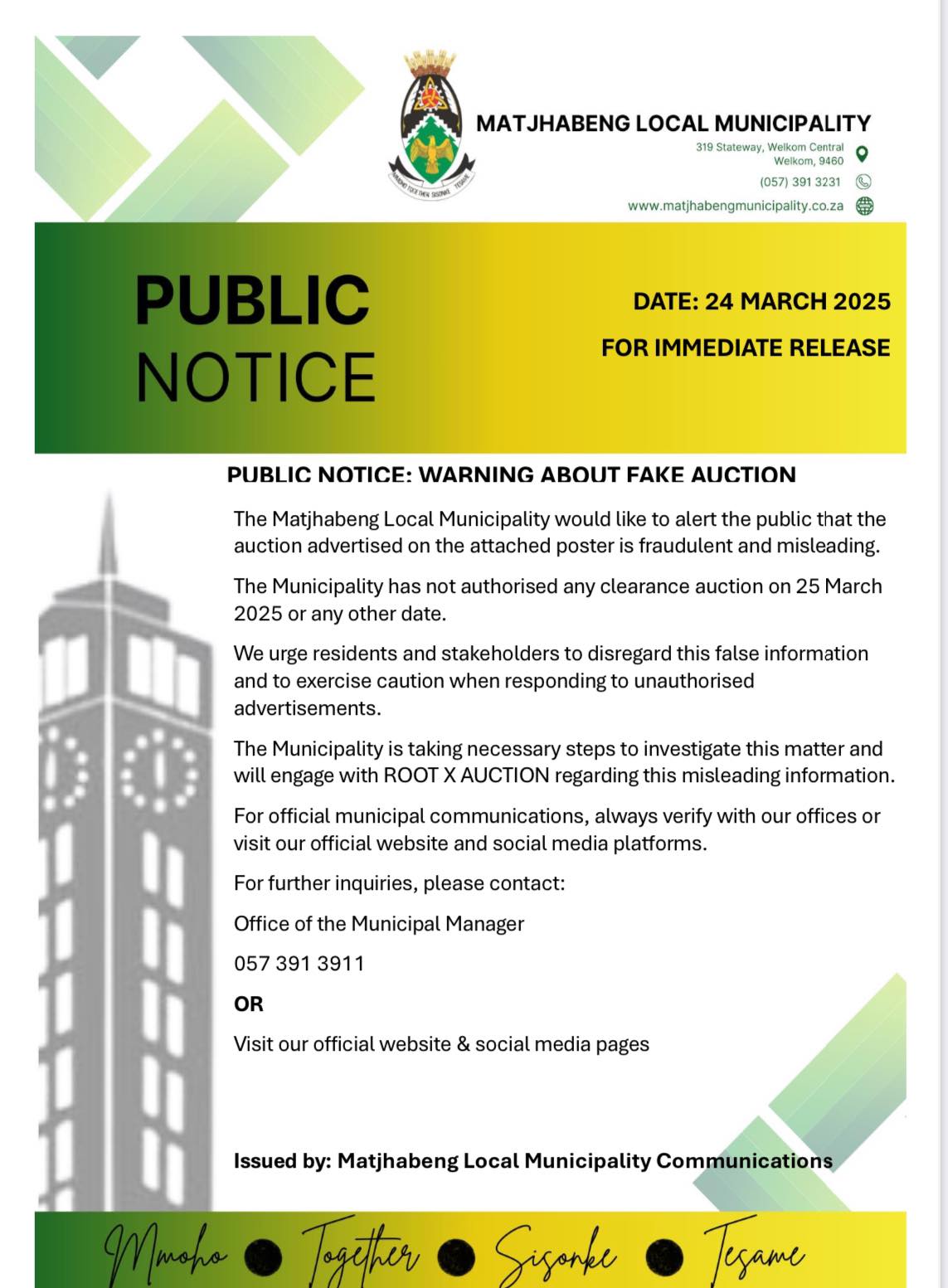 The Matjhabeng Local Municipality would like to alert the public that the auction advertised on the attached poster is