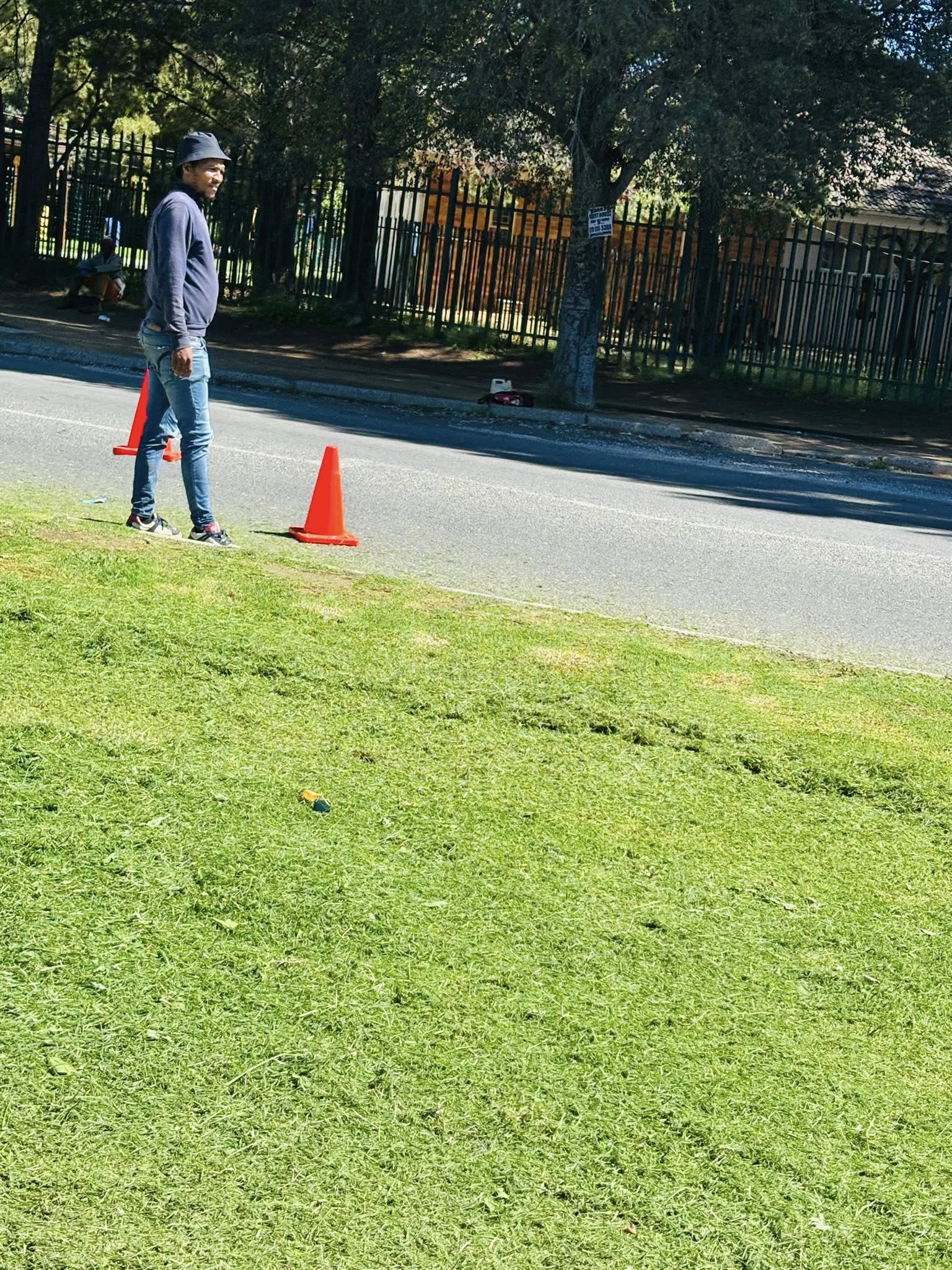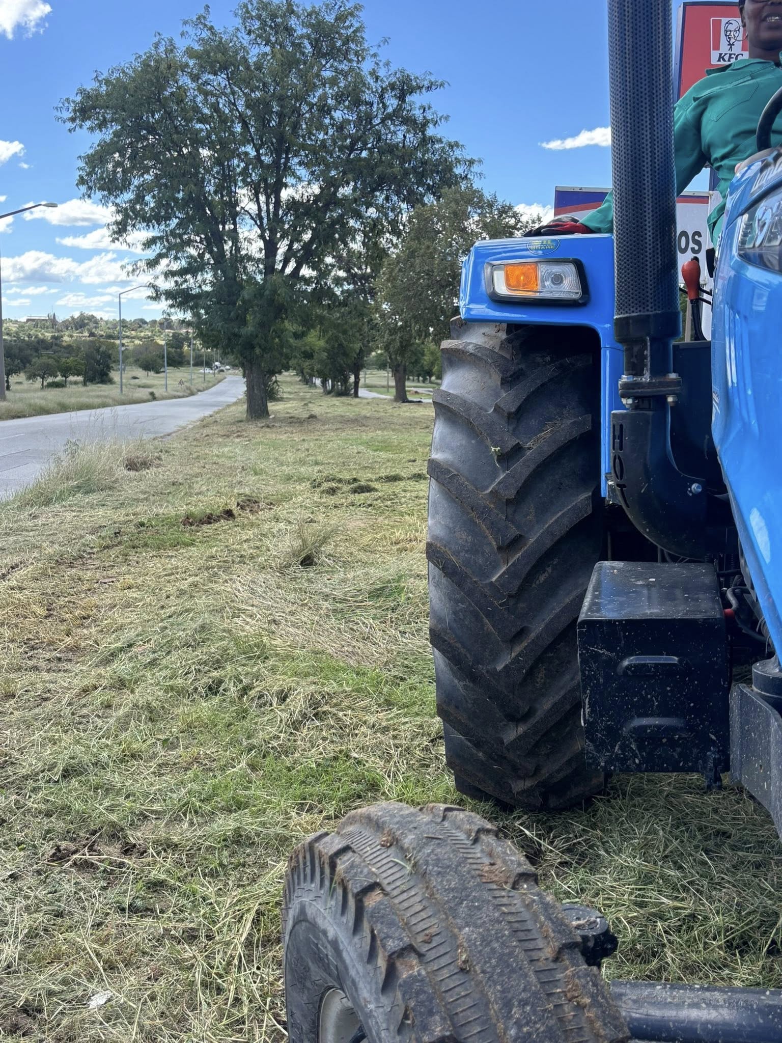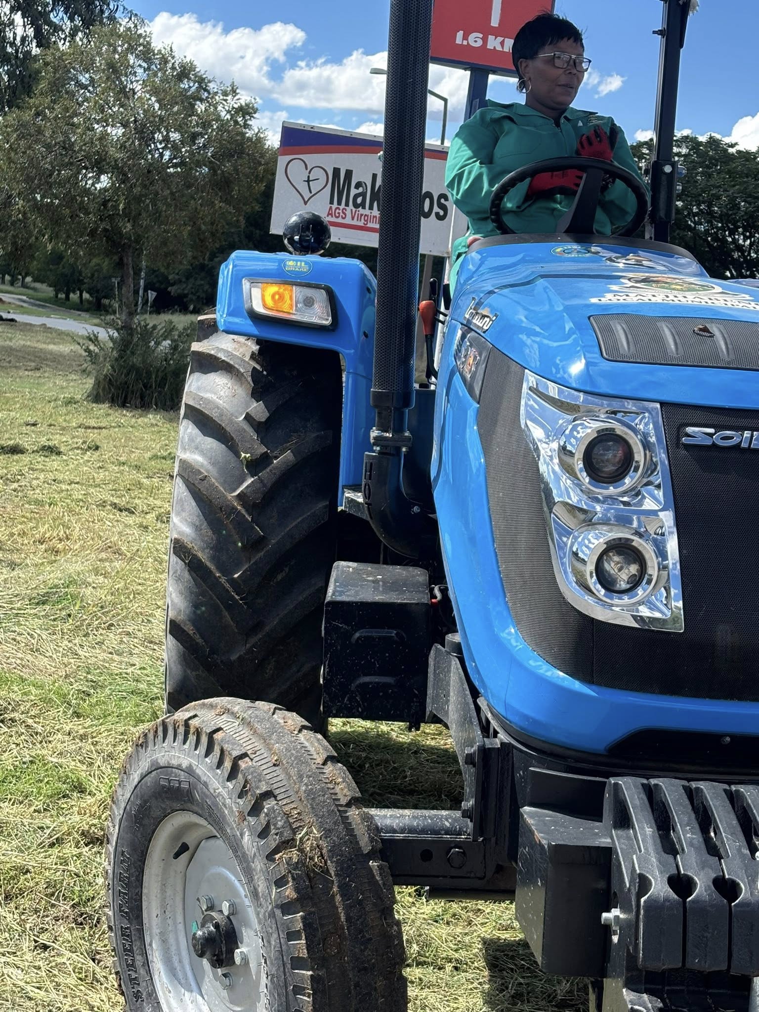 A female municipal worker from Matjhabeng skillfully operates a tractor while cutting grass in Virginia. A clear