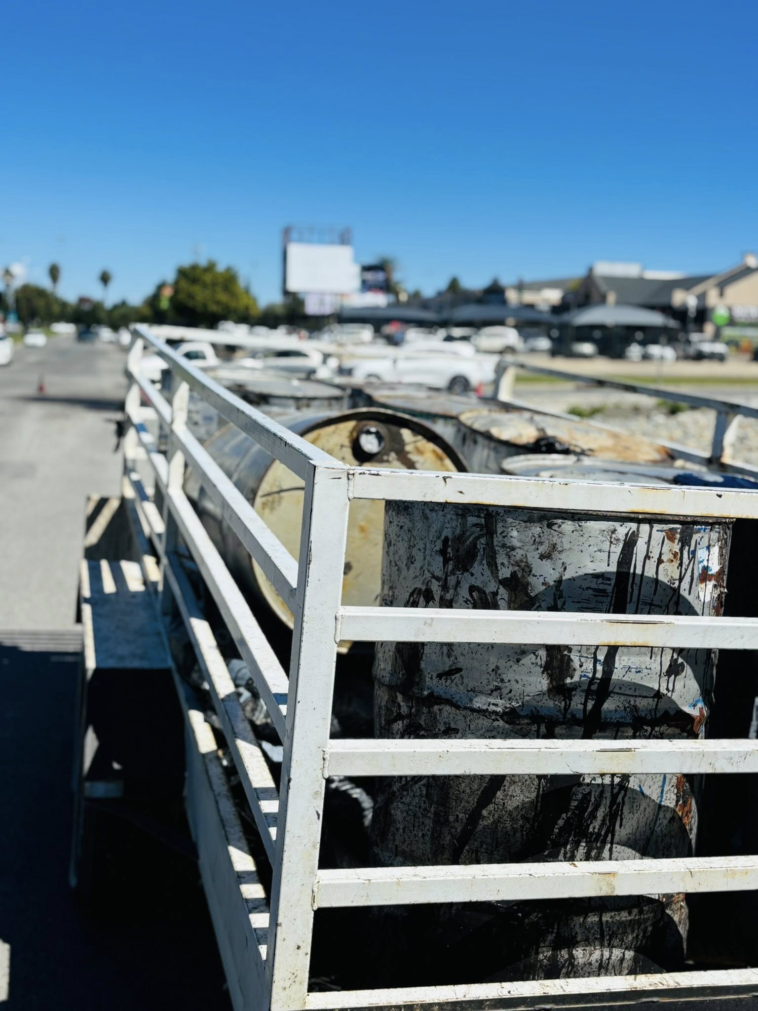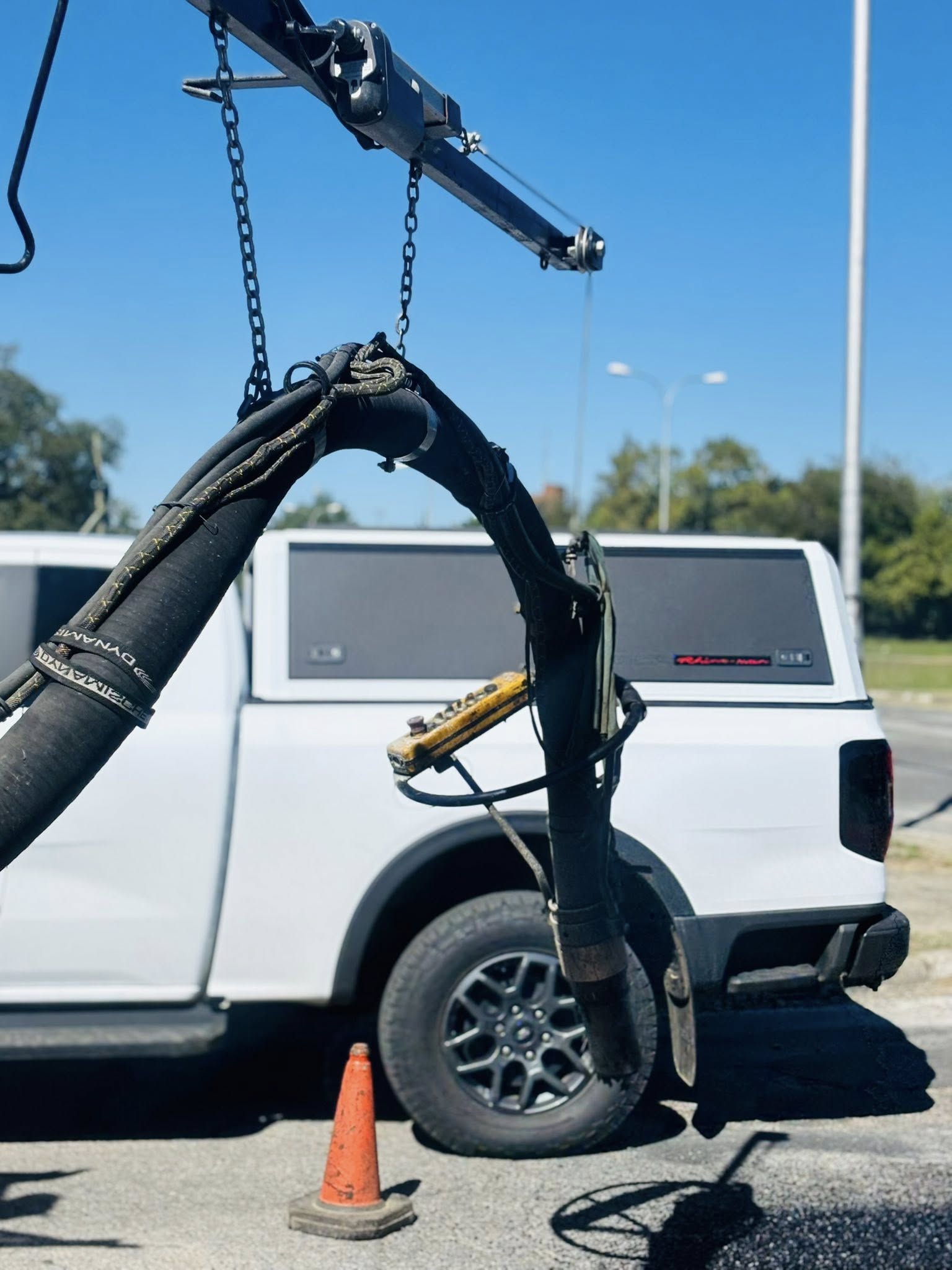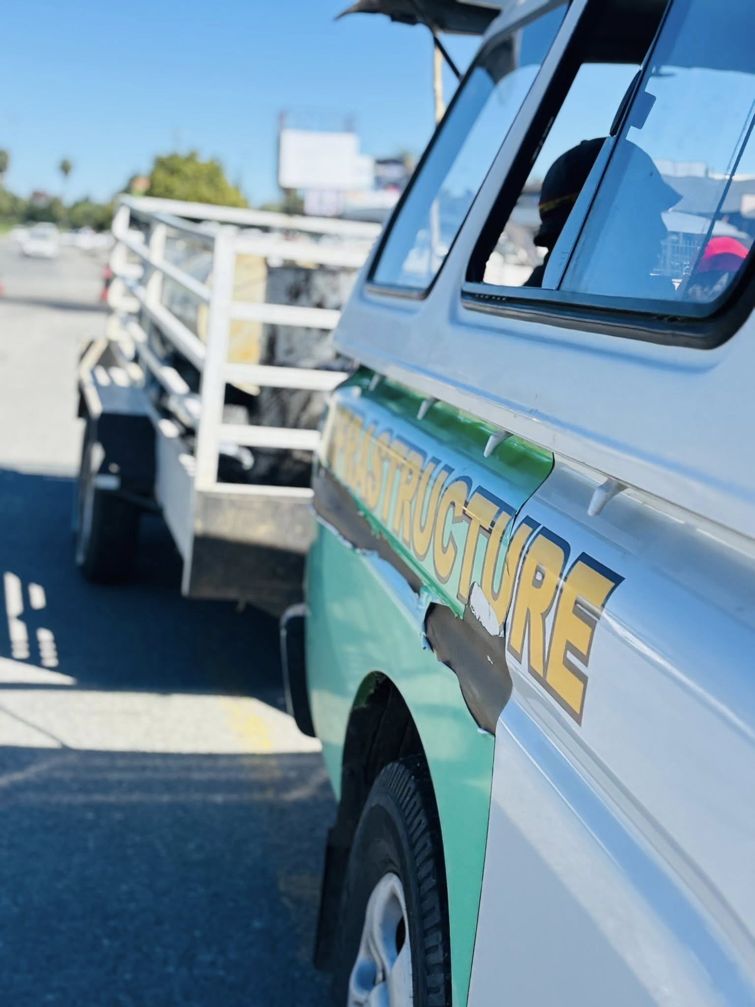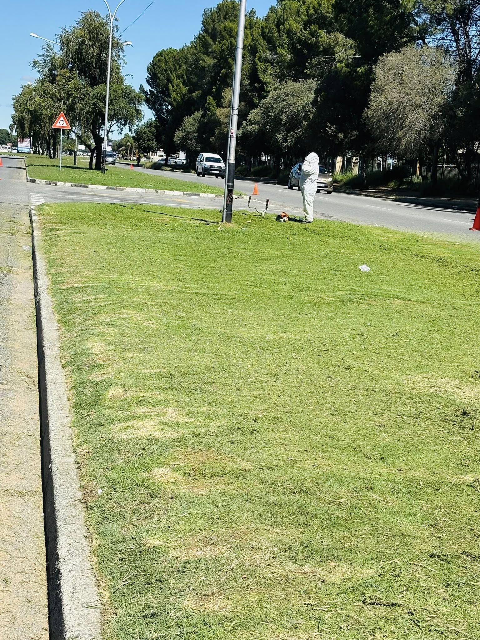 A female municipal worker from Matjhabeng skillfully operates a tractor while cutting grass in Virginia. A clear