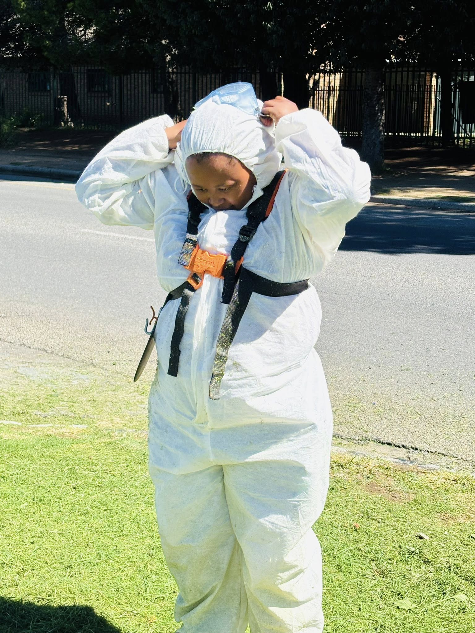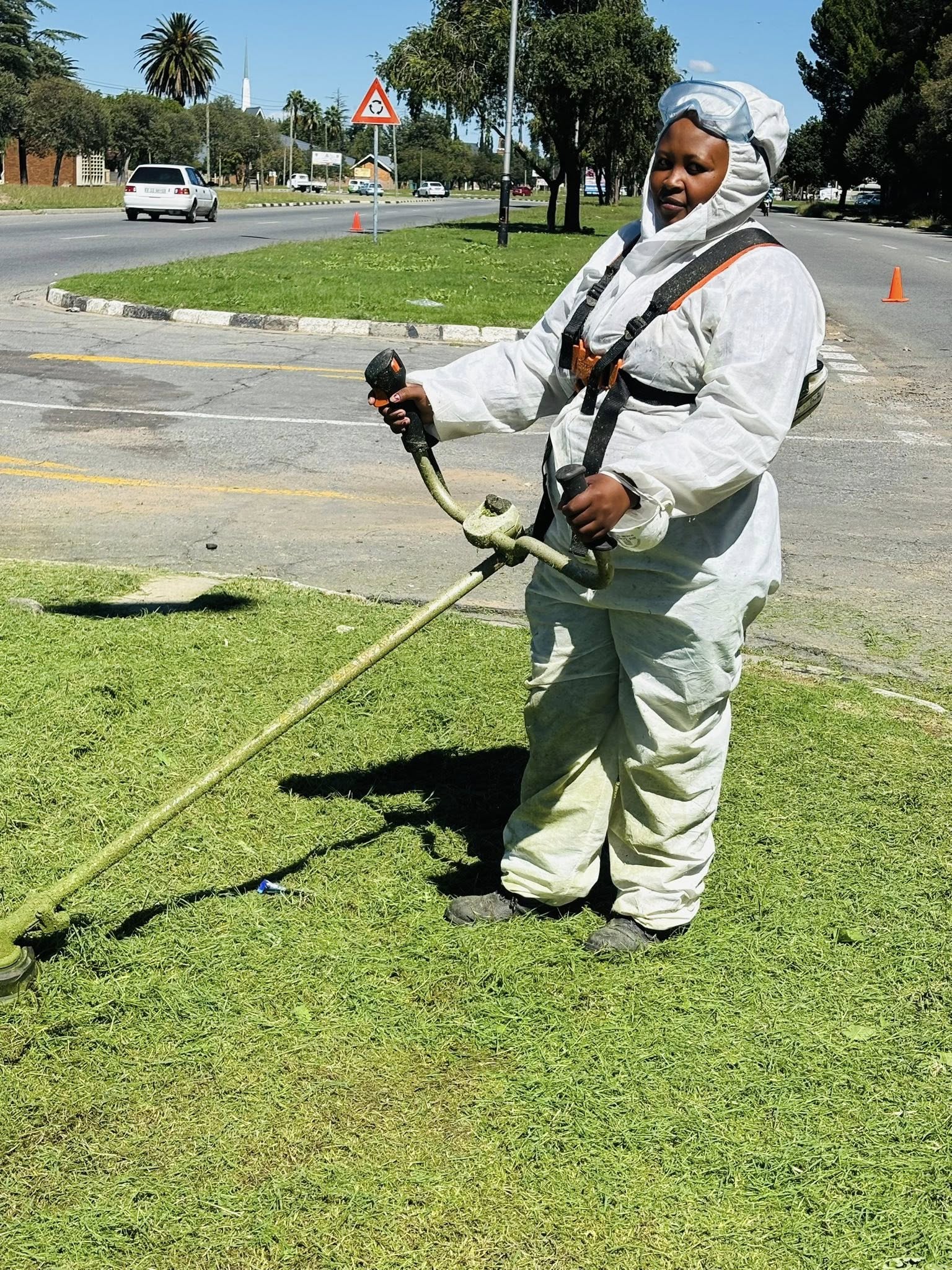 A female EPWP participant from Matjhabeng skillfully operates a bush-cutting machine while clearing grass in Welkom.