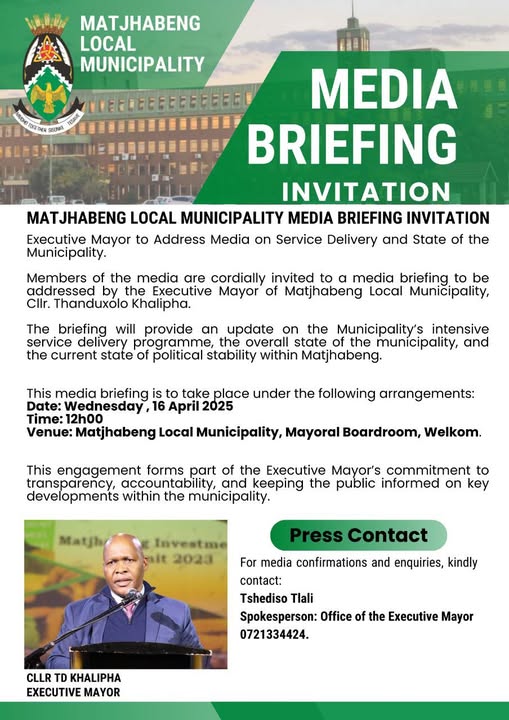 Members of the media are cordially invited to a media briefing to be addressed by the Executive Mayor of Matjhabeng