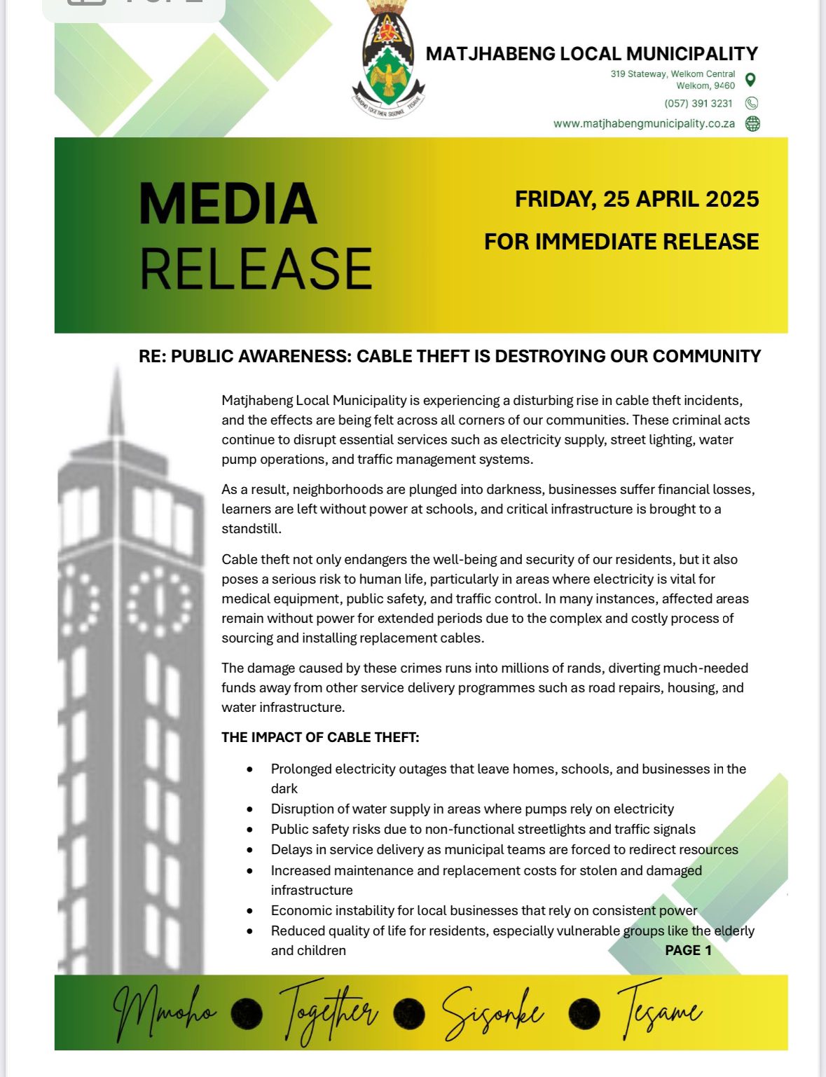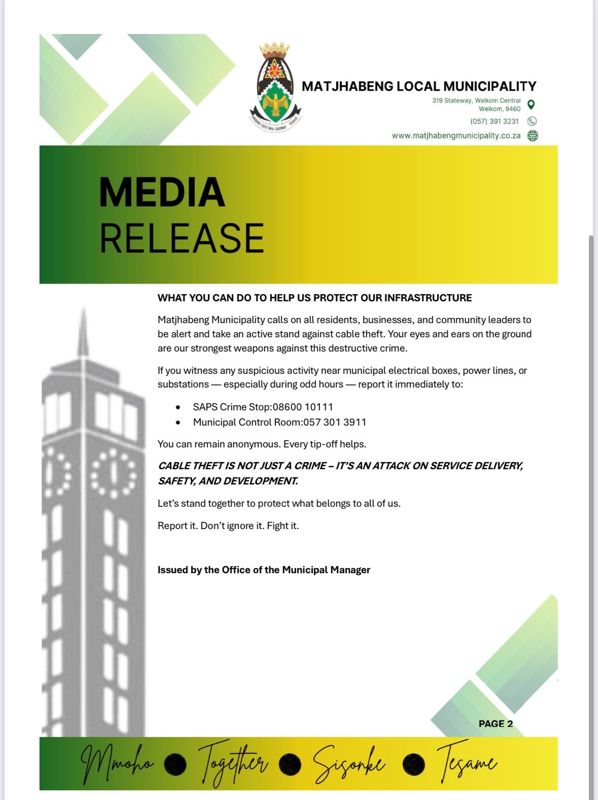 Matjhabeng Municipality calls on all residents, businesses, and community leaders to be alert and take an active stand