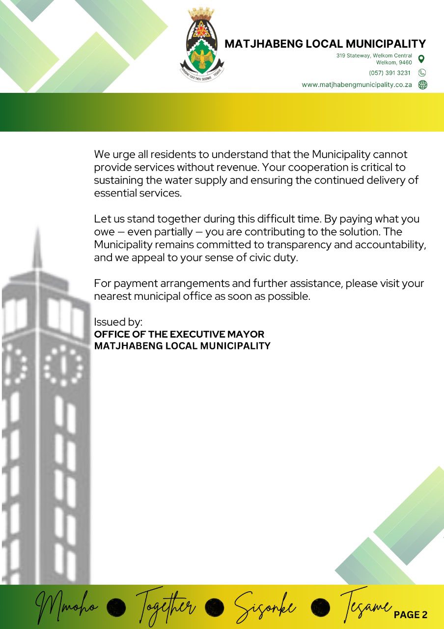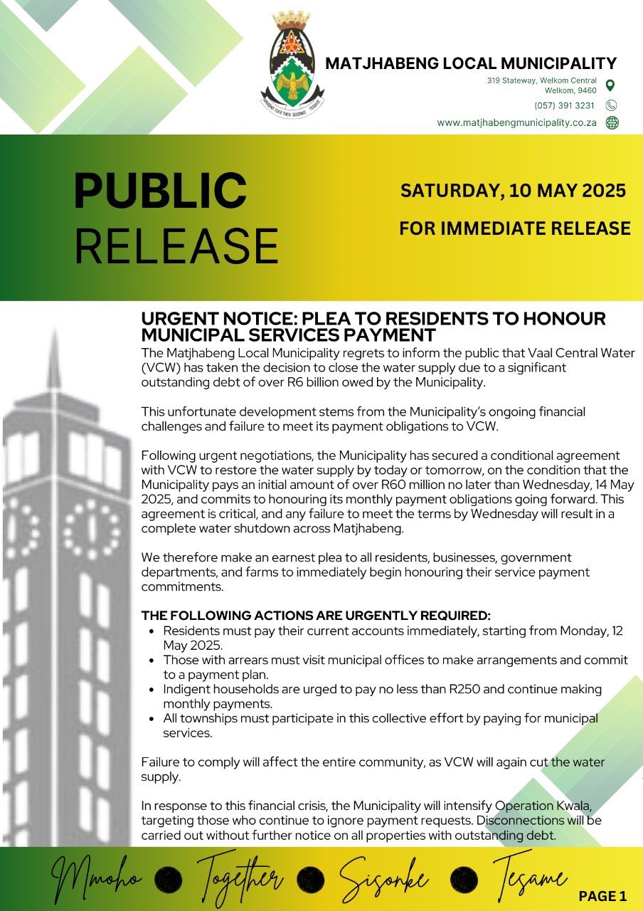 critical, and any failure to meet the terms by Wednesday will result in a complete water shutdown across Matjhabeng.