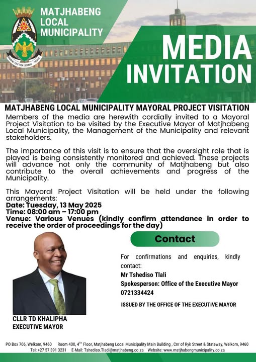 The Executive Mayor of Mathabeng Local Vunicipality, Clir Thaduxolo Khalipha, will today conduct a Mayoral Visitation to