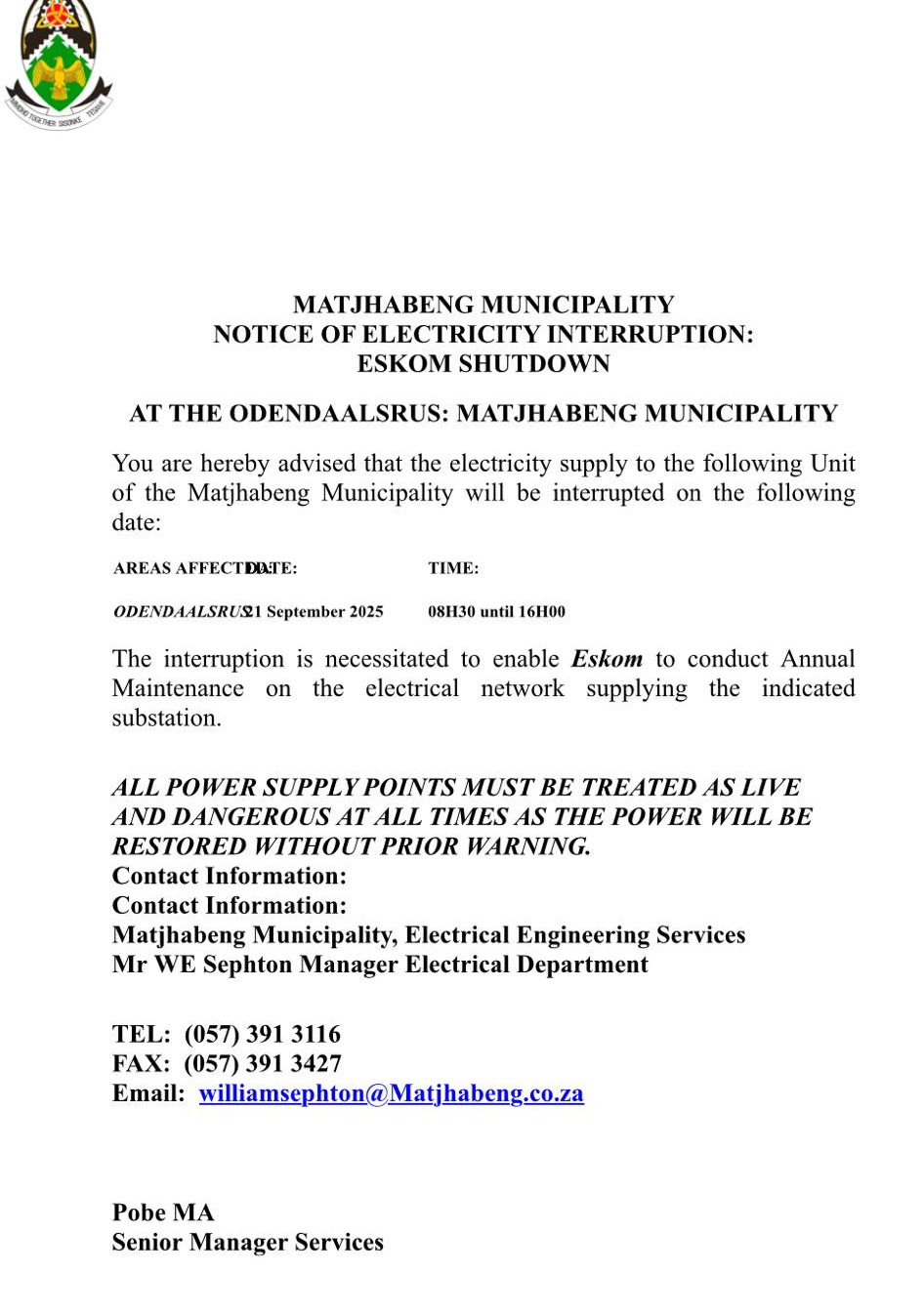 Matjhabeng Municipality Notice of Electricity interruption: Eskom shutdown, areas affected are Odendaalsrus